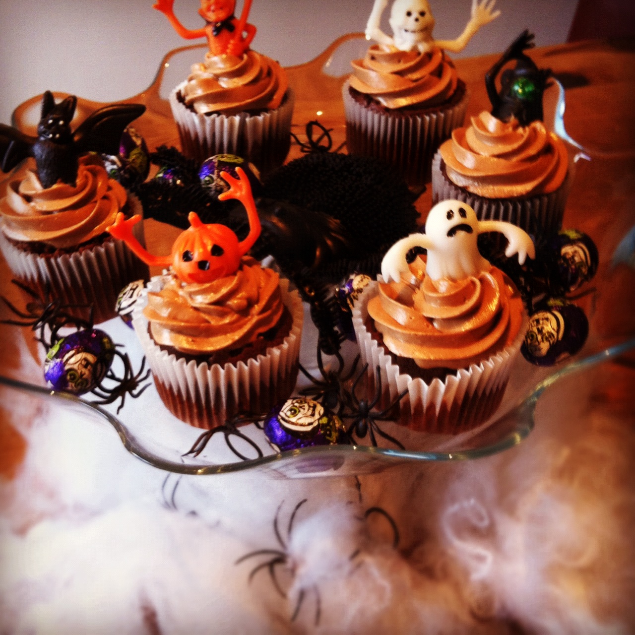 At this stage you can smear the cupcake with the buttercream or else level of the top of them and pipe it on. I used a Wilton 1m nozzle to decorate mine. I started off on the outside of the cake and worked inwards to the middle then piped another swirl on top of this. I used little plastic Halloween figures to top some of them which the kids absolutely loved and I left the rest plain. Totally delicious and most definitely on the "make again" list!